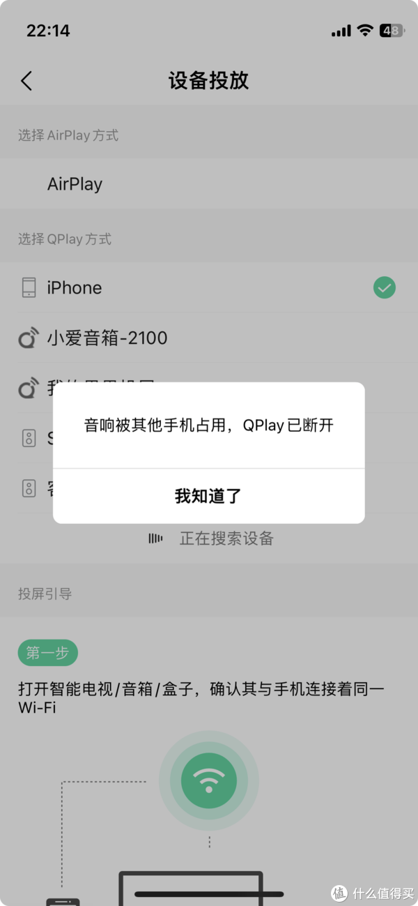 最后说的是腾讯自己的Qplay(现在在苹果手机上叫设备投放),这个是在折腾DLNA的时候发现这个协议是腾讯自己推出的。QQ音乐上的DLNA也是通过Qplay实现的。 对DLNA失望后,无意中发现家里的小爱音箱是支持Qplay的(因为支持Qplay的设备图标和DLNA的不一样),然后各种操作都可以顺利的实现,切歌,前进后退,音量控制都可以。但是说实话设备的支持面还是比起Airplay和DLNA还是差很多的。